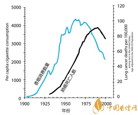 大家一看這個(gè)圖,就會(huì)發(fā)現(xiàn)吸煙數(shù)量和肺癌死亡數(shù)量的曲線幾乎一模一樣,但有大約25年的滯后:吸煙增加,肺癌會(huì)在25年后相應(yīng)增加,吸煙減少,肺癌也會(huì)在25年后相應(yīng)減少。這個(gè)奇特的滯后主要是因?yàn)榉伟┌l(fā)生是個(gè)非常慢的過程,從癌前變異,到早期癌癥,到晚期癌癥,一般需要10~20年時(shí)間。
