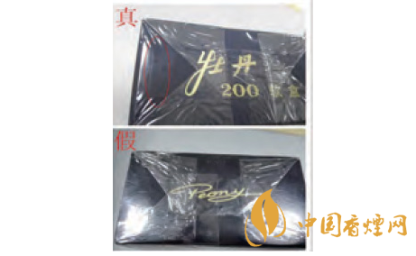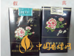 正面商標紙差異對比:真品卷煙采用絨面印刷工藝,花形悉心勾勒,更顯質(zhì)感,圖案“牡丹花”更為寫實。假冒偽劣“牡丹(軟藍)”多以舊版“牡丹花”造型進行模仿,其圖案與真品存在明顯差異。