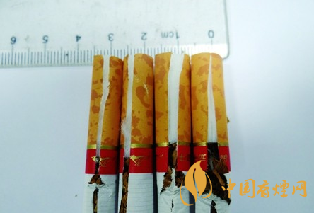 煙支濾棒長度差異比對:撕開接裝紙,真品煙支濾嘴棒長度大于2.5cm,濾嘴棒長度超出接裝紙金線圈部分;若不撕破接裝紙判斷時,可用手輕捏濾棒長度是否與接裝紙紅色“奔狼”圖案平齊;假煙濾嘴棒長度小于2.5cm,不撕破接裝紙判斷時,用手輕捏濾棒長度只到接裝紙金線圈處,與真品煙濾嘴棒長度差異明顯。