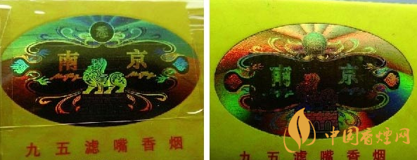 小盒頂部鐳射燙印防偽標(biāo)識差異比對:真品卷煙小盒頂部鐳射燙印防偽標(biāo)識圖案中幾個切換亮點(diǎn),南京、辟邪和二龍戲珠組合,切換不同角度時,幾組鐳射燙印會呈現(xiàn)出不同防偽效果圖案,二龍戲珠里暗藏有重疊“九五香煙”四個字,切換角度時,幾個字能自由切換出來,鐳射燙金仿制難度極高;假煙小盒頂部鐳射燙印防偽標(biāo)采用“掃描照相”等仿制技術(shù),套色燙金嚴(yán)重失真,特別是二龍戲珠暗藏的“九五香煙”四個字模糊不清無法呈現(xiàn)出來,與真品鐳射燙印防偽標(biāo)識差異明顯。