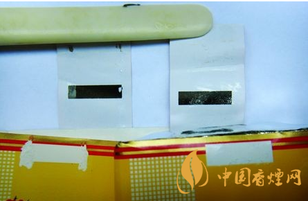 二、小盒頂部封簽?zāi)z水痕跡差異比對:真品小盒封簽均為機器上膠,上膠均勻且有規(guī)則;假煙多為手工涂膠痕跡,上膠無規(guī)則,與真品卷煙工藝比對存在明顯差異。