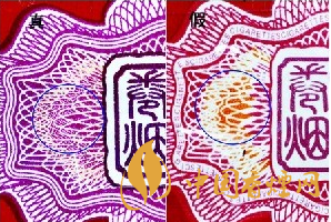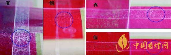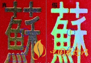 如圖所示:“蘇煙”的封簽采用“鈔細(xì)線”防偽印刷,真煙的線條清晰,色彩濃厚,印刷精細(xì);假煙的線條模糊,色彩清淡,印刷粗糙。