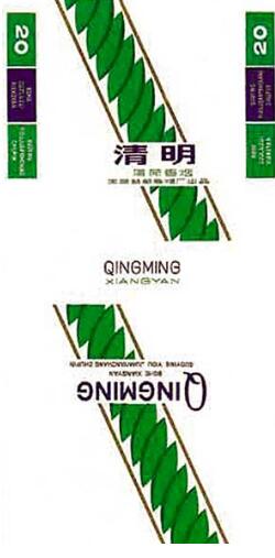中國(guó)第一個(gè)以“清明”為牌名的煙標(biāo),是由山東益都(今青州)卷煙廠出品的“清明”煙標(biāo)。白底色的畫面上醒目的“清明”兩字,底下是拼音字母“QINGMING”。綠色的枝葉簡(jiǎn)潔而素雅,賦予了“萬(wàn)物生長(zhǎng)此時(shí),皆清潔而明凈”的含義。
