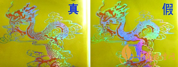 2.真品小盒正面套印定位燙金“飛龍”圖案鱗片清晰,從頭至尾都能看到定位燙金工藝,紅色貫穿整個(gè)龍身,“鱗片”是雪里透紅,栩栩如生;假煙套印定位燙金仿制較差,鱗片無法達(dá)到真品的印刷工藝水平,與真品存在明顯差異。