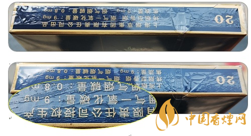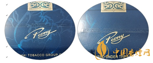 真品卷煙:藍(lán)色牡丹花圖案,側(cè)光觀察線條明亮、反光度強(qiáng);線條油墨厚實(shí),手摸有凸起感。