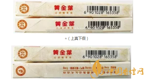 真煙:黃金葉(天香細(xì)支)拉線(xiàn)頭位置(在標(biāo)有生產(chǎn)廠家)在條形碼左側(cè),條形碼及數(shù)字筆畫(huà)較細(xì)。